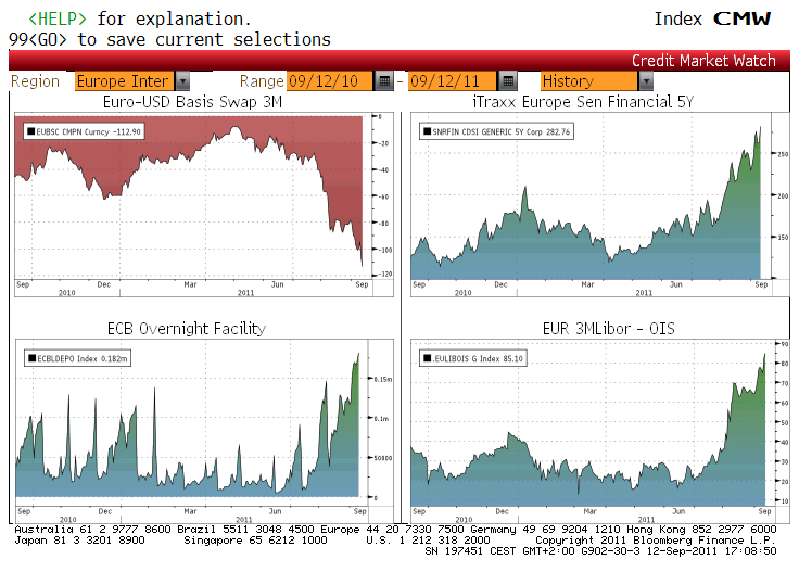 Per chi ha Bloomberg, è molto utile la pagina CMW (selezionate poi la Region “Europe Interbank”), che permette di monitorare costantemente la situazione nell’interbancario. Le banche europee stanno assolutamente affrontando un problema di US dollar funding: da parte delle controparti US non c’è fame di Commercial Paper/Deposits oltre una settimana di duration. Se si guardano alcune misure di stress nel mercato monetario (spread Eur 3m Libor / OIS oppure l’EUR/USD FX Basis Swap a 3m), il trend è chiaramente in deterioramento, e in accelerazione nonostante l’intervento della BCE.